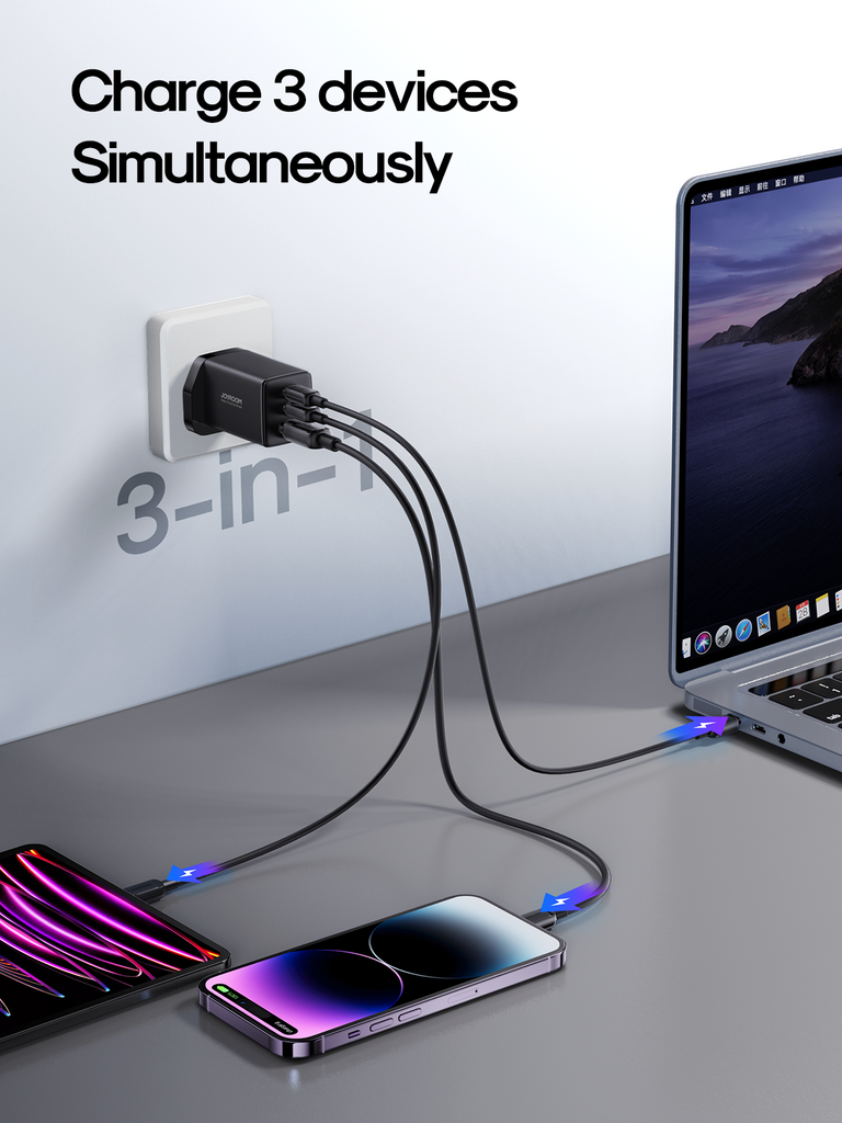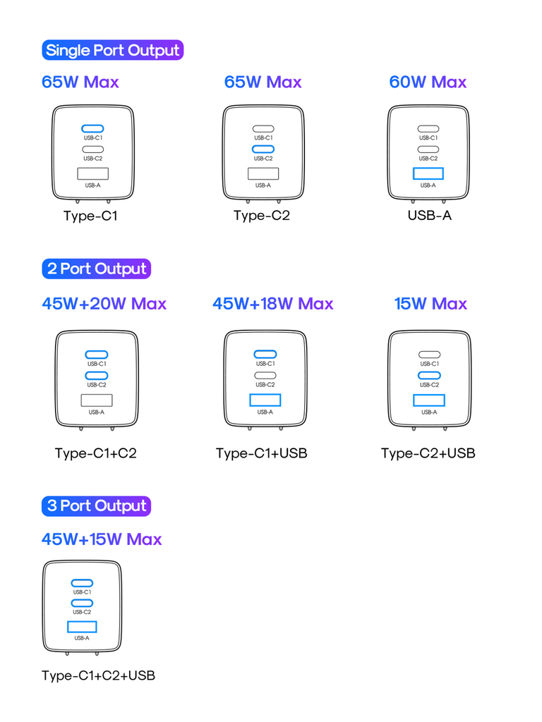 USB-C1+C2+USB-A Output: 45W+15W (Max)