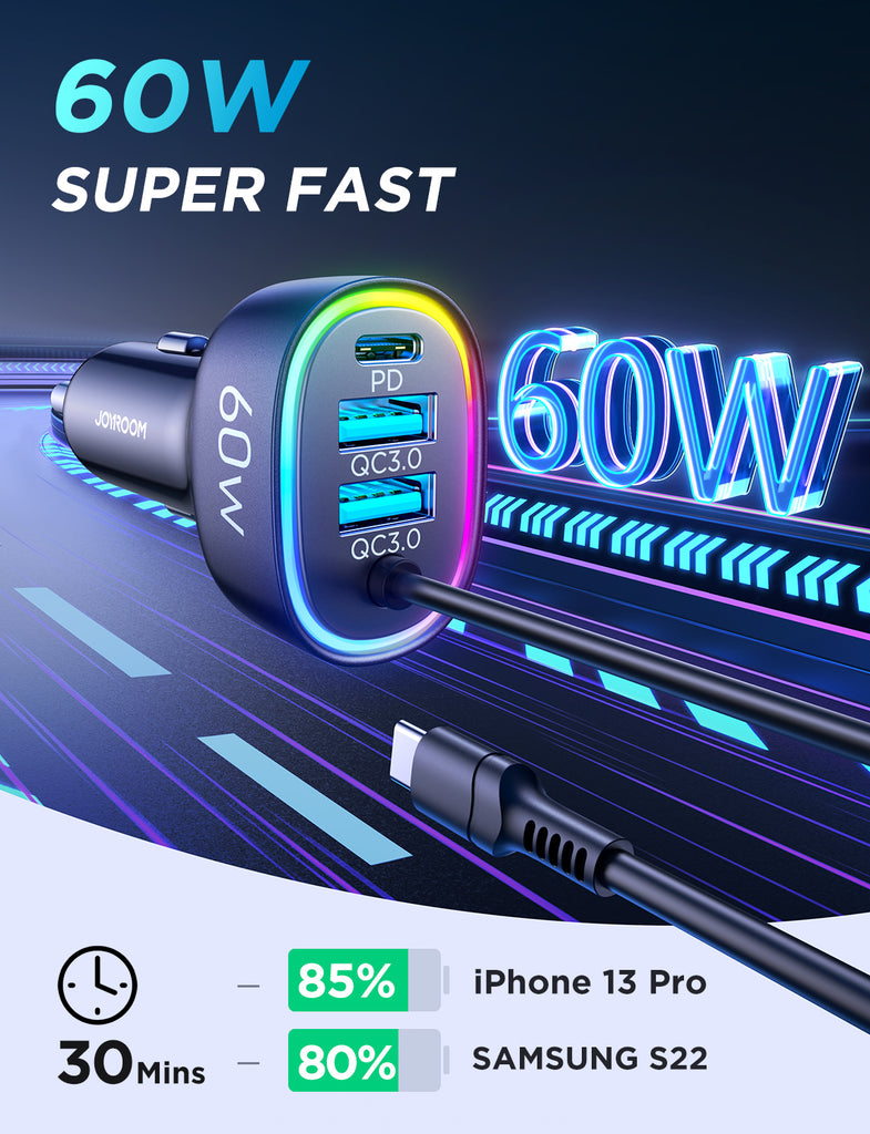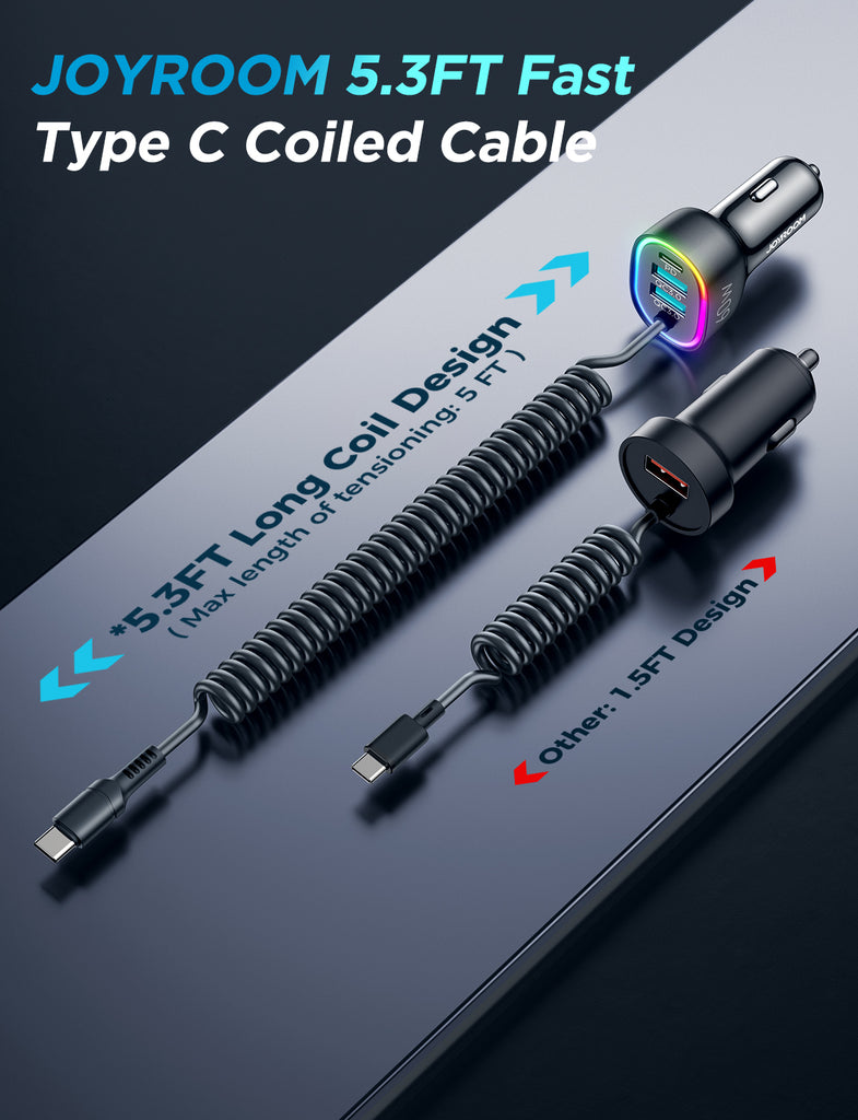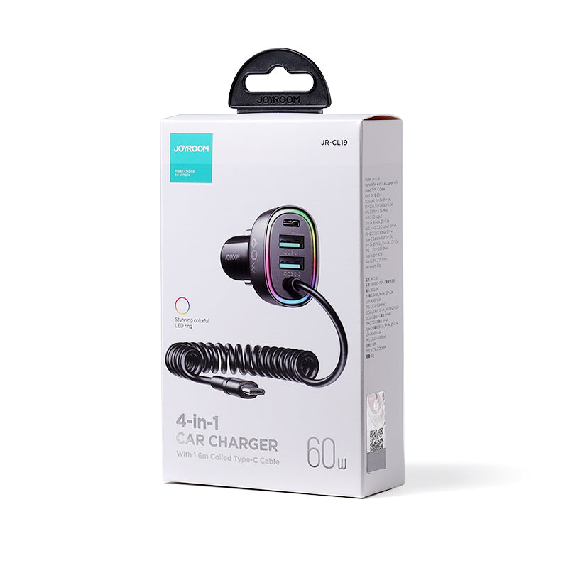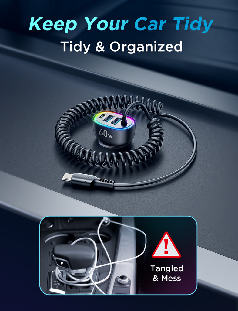 Name: 60W 4-in-1 Car Charger with Coiled TYPE-C Cable